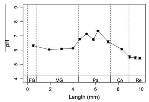 圖4。臺灣褐飛虱腸道系統(tǒng)的軸向pH分布。所有值均在腸腔中心測量,并以五個獨立輪廓的平均值±SE表示。