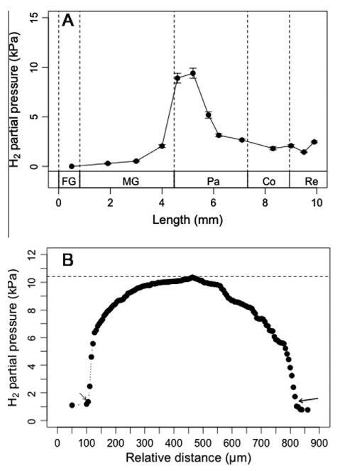 作為白蟻腸道共生體代謝的中心中間體,還記錄了臺灣白蟻腸道系統(tǒng)的軸向和徑向氫濃度分布。氫微電極測量顯示,在各種腸道腔室的中心,氫分壓范圍很廣(圖6A)。在前腸,氫分壓始終低于檢測限。對于中腸,氫壓分別在前腸、中腸和后腸區(qū)域顯著增加。氫在后腸前腹部積聚,導致最高氫分壓為9.4±0.5 kPa。然而,從前腹部到中腹部的比例急劇下降,在后腹部和結(jié)腸中也有類似的趨勢。除前腹部外,只有直腸有氫積聚,觀察到相對較高的氫分壓約為2.5±0.1 kPa。
