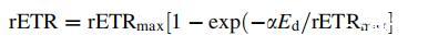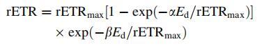 rETRmax表示無光抑制時(shí)的最大潛在rETR。a是飽和開始前光照曲線的初始斜率,表示光照利用效率。Ed是輻照度(通式為400–700 nm)。b是表征光抑制的參數(shù)。在光線曲線中沒有光抑制的情況下,b=0,函數(shù)變?yōu)椋?