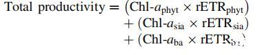 浮游植物、海冰藻類和底棲藻類的相對(duì)貢獻(xiàn)如McMinn等人(2005)所述,即通過將各成分的面積(m-2)chl-a濃度乘以其在最大環(huán)境輻照度下的各自rETR來計(jì)算。