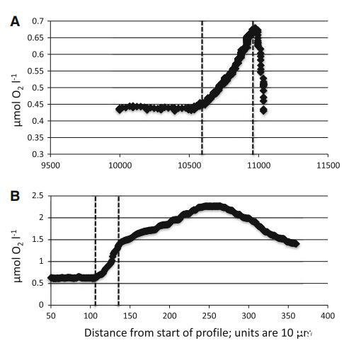 圖3從海冰(2004年12月2日下午2:44棕色海灣)和b底棲藻類群落(2004年12月1日下午2:14凱西碼頭)的氧微電極測量中獲得的擴(kuò)散邊界層(DBL)的氧剖面示例。垂直刻度表示擴(kuò)散氧通量,水平刻度表示距離輪廓起點(diǎn)的微米距離。擴(kuò)散邊界層用虛線標(biāo)出
