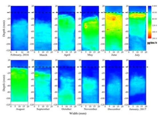 從2016年2月到2017年1月,每月從采樣點采集九個沉積物芯(直徑9厘米,長度30厘米)。現場將每個巖芯中沉積物和上覆水的厚度調整至約20 cm。采集后3小時內將巖芯運送至實驗室。將三個巖心放入一個槽中,培養2-3天,以部署HR Peeper和Zroxide DGT探針。使用循環水浴將現場溫度保持在同一水平。對于HR-Peeper和Zr-oxide DGT探針的部署,首先將一個HR-Peeper探針插入其中一個芯中并部署24小時。隨后,將一個Zr-oxide DGT探針插入同一個芯中,并將其再培養24小時。使用7月收集的芯進行初步試驗,結果表明,在培養3天之前或之后,沉積物中溶解氧濃度(DO)和溶解氧滲透深度(OPD)沒有顯著變化(圖S1)。