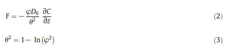 根據菲克第一定律(Boudreau 1996),根據公式(2)計算穿過SWI的SRP(F)擴散通量,并使用公式(3)計算沉積物彎曲度(Boudreau 1996):