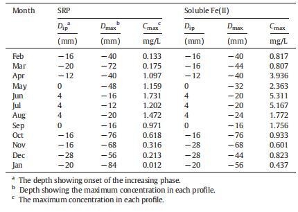 為了更好地描述SRP和可溶性Fe(II)剖面的特征,表3總結(jié)了增加階段(Dip)開始的深度、每個剖面中的最大濃度(Cmax)以及出現(xiàn)最大濃度(Dmax)的深度。對于SRP,傾角從?3月為20毫米,6月至8月為4毫米,隨后下降到更深的水平?12月28毫米。Dmax也變得較淺?3月至3月為72毫米?7月為12毫米,隨后深度下降至?2017年1月為84毫米。Cmax從2月的0.133 mg/L增加到6月的1.73 mg/L,然后在2017年1月下降到0.01 mg/L。可溶性Fe(II)的傾角、Dmax和Cmax的變化與SRP的變化相似,在6月至8月期間,最淺的傾角為4mm,最淺的Dmax為4mm?9月為16毫米,6月最大Cmax為5.31毫克/升。