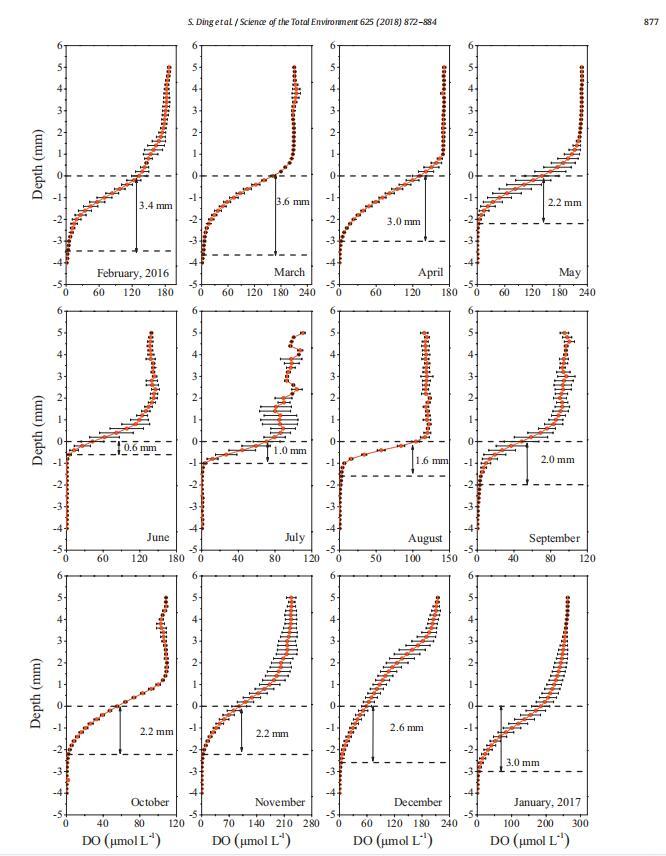 圖3。2016年2月至2017年1月期間每個月沉積物水剖面中溶解氧濃度和滲透深度的變化。數(shù)值為三次重復(fù)分析的平均值±標準差。