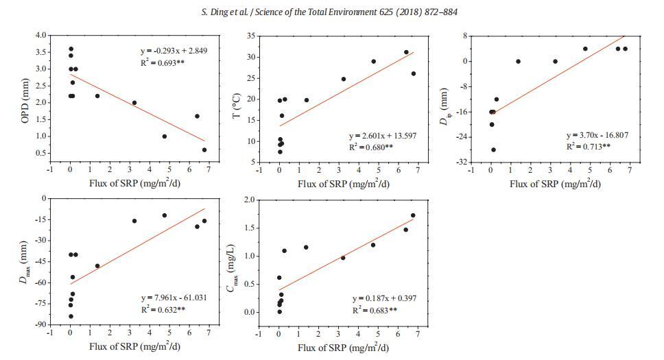 圖7顯示了每個月SWI的SRP通量,范圍從?12月為0.01 mg/m2/d,6月為6.76 mg/m2/d(負號表示向下通量)。從2月到7月,通量呈上升趨勢,并在8月之前保持在較高水平(4.75–6.76 mg/m2/d),隨后在2016年12月之前有所下降。最大正通量出現(xiàn)在6月,比10月的最小正通量高337倍。發(fā)現(xiàn)SRP通量與OPD、溫度和移動P的三個剖面特征參數(shù)(Dip、Dmax和Cmax)呈線性相關(guān)(圖8)。