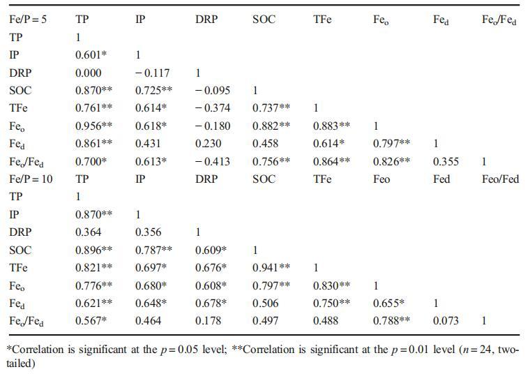 土壤鐵氧化物的轉化是控制磷有效性的一個重要機制,尤其是Feo的影響(Su等人,2001年;Gao等人,2002年)。在Fe/P比為10時,溶解活性磷(DRP)與Feo呈強相關(r=0.608,P<0.05;表4),表明隨著Feo的增加,DRP逐漸增加,從而提高了土壤有效磷含量。這種情況與鈣質土壤不一致(Zhu等人,1993年),但支持旱地土壤的研究結果(Wang等人,2008a)。此外,土壤物質組成也會影響土壤P的行為。傳聞證據表明,溶解活性磷與TP不完全相關,但與土壤有機質呈正相關或負相關(Jia和Li,2011;Liu等人,2012)。在該研究中,我們發現DRP和TP之間沒有顯著相關性,DRP和SOC之間的正相關性僅出現在鐵磷比為10時(表4),這可能與鐵輸入濃度對耦合元素循環的影響有關。