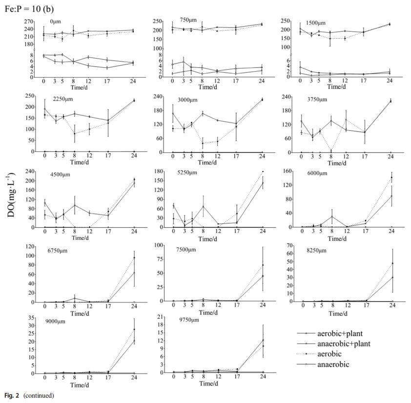 3.2不同鐵磷比下土壤元素的積累特征DO濃度分為三類:0-1500、2250-5250和≥6000,不考慮Fe/P(圖2a,b)。當深度小于1500μm時,所有四種處理的DO濃度都是穩定的。由于氧氣的引入,有氧組保持較高的DO濃度,其他兩組在4 mg L左右波動?1因為氮氣的引入。在2250和5250μm之間的深度,溶解氧濃度隨波動而增加。深度大于6000μm時,溶解氧濃度達到極限值(0.3 mg L?1),但在有氧條件下第12天后增加,表明深層土壤中的DO濃度降低,但隨著時間的推移迅速增加。土壤Eh值在兩種不同的鐵磷比之間差異很大。鐵磷比為5時,不同處理的土壤Eh值不同(圖2c)。好氧+植物處理的土壤Eh值向上波動,而厭氧+植物處理的土壤Eh值降至最低(第5天),然后緩慢上升,而對照處理的土壤Eh值則波動并下降。在鐵磷比為10的情況下,土壤Eh值通常先降低后升高(圖2d)。