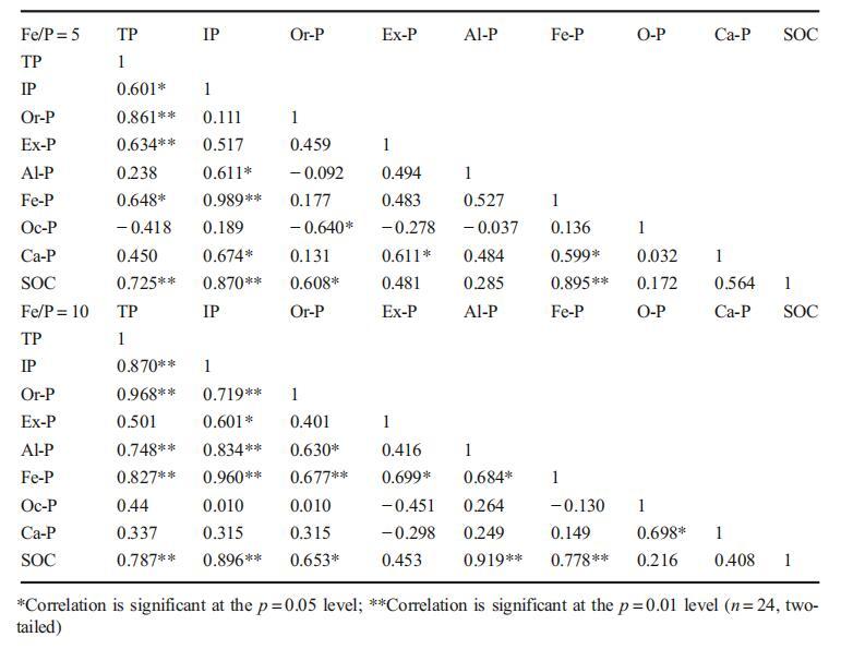 表5不同鐵磷比下磷形態與土壤有機碳的相關性