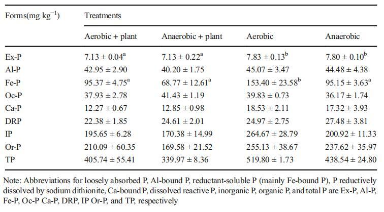 環境因子(DO和Eh)的變化影響土壤元素的積累。土壤磷形態的含量見表2和表3。小興凱湖濕地土壤有機磷和有機磷含量分別占總磷含量的50%左右。不同IP組分的減少順序為Fe-P>Al-P>Oc-P>Ca-P>Ex-P。不同處理之間的Fe-P、Ex-P或Al-P含量存在顯著差異,但Oc-P、Ca-P和DRP沒有顯著差異(表2和表3)。此外,我們還發現,在四種處理中,有氧條件下的磷形態含量最高。