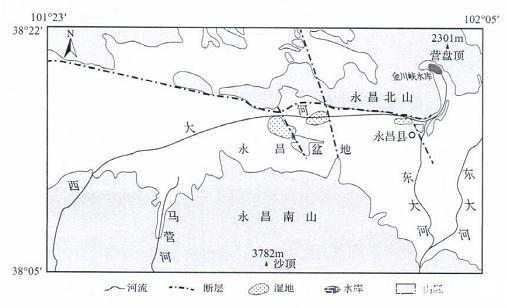 河西走廊西大河流域的永昌盆地介于永昌南山與永昌北山之間(下圖),海拔1875~2106m,地勢自西南向東北傾斜。盆地內(nèi)分布有若千塊濕地,這些濕地的形成是地形、地質(zhì)條件及地表水、地下水共同作用的結(jié)果。金川峽水庫位于盆地最低處,是當?shù)厣a(chǎn)和生活的重要水源地。