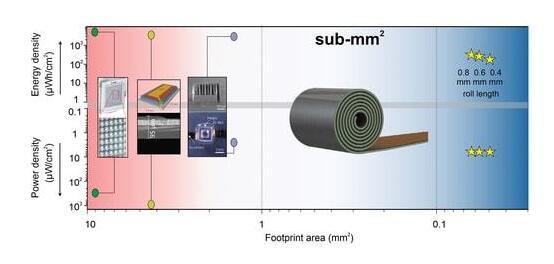 決定微型電池能否最終應用到微系統中的核心參數是可用的能量。簡而言之,微型電池(占地面積<1 mm2)的能量密度至少為100μWh/cm2才有應用空間。