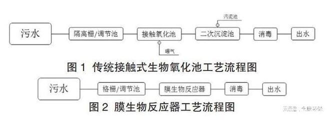 膜生物處理技術(shù)主要包括膜分離裝置、曝氣裝置、萃取反應(yīng)器。其中膜分離反應(yīng)器因其獨(dú)特的生物特征,成為最廣泛應(yīng)用的裝置。在實(shí)際污水處理運(yùn)行的過程中,根據(jù)生物膜在反應(yīng)器中的位置,可以將膜生物反應(yīng)器分為不同的類型,包括一體式類型、分離式類型等。除此之外,厭氧反應(yīng)器及好氧反應(yīng)器都可以運(yùn)用到污水處理程序中。膜生物反應(yīng)工藝與傳統(tǒng)污水處理工藝比較如圖1~2。