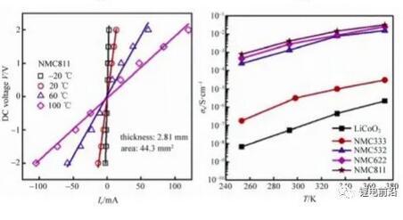 圖6直流極化或伏安特性曲線,用來測試鈷酸鋰和三元NMC的電子電導率。(a)鈷酸鋰;(b)NMC333;(c)NMC532;(d)NMC622;(e)NMC11;(f)與溫度關聯的電子電導率