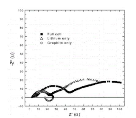 (4)兩電極阻抗等于三電極阻抗譜中正極部分和負極部分的阻抗之和;(5)電池中的阻抗可能主要來源于正極。