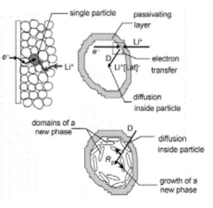 電子通過活性材料顆粒間的輸運、Li+在活性材料顆粒空隙間電解液中的輸運;
