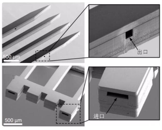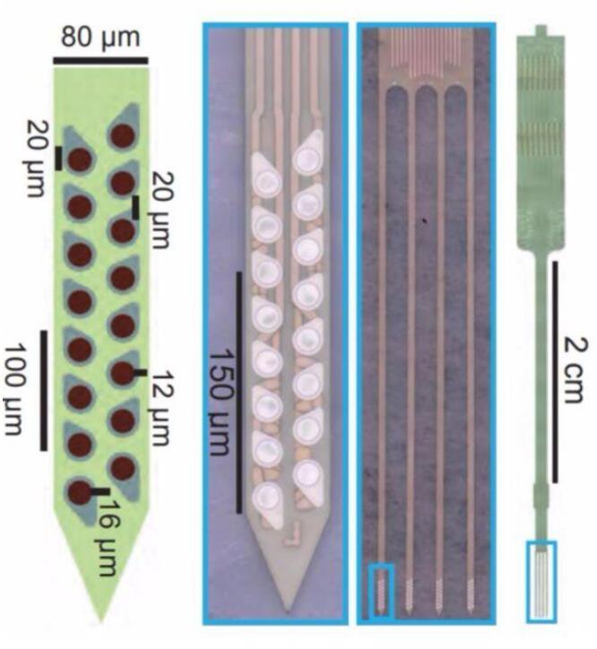 隨著神經(jīng)科學(xué)的快速發(fā)展,研究者對(duì)神經(jīng)微電極的要求也不再僅僅局限于記錄神經(jīng)元的動(dòng)作電位,而是希望在滿(mǎn)足基本的記錄功能的基礎(chǔ)上,增加其他的功能。例如,集成有微流體通道的神經(jīng)微電極,如下圖所示[5]。