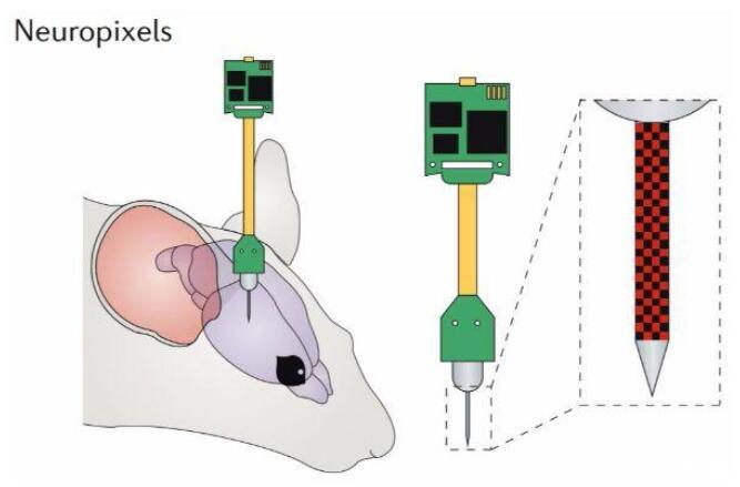 在空間分辨率方面有重大突破的當(dāng)屬Neuropixels神經(jīng)電極[2]。Neuropixels神經(jīng)電極的形狀為寬70 um,長(zhǎng)10mm的針狀,在電極上分布有多達(dá)960個(gè)12 um*12 um的方形神經(jīng)電信號(hào)采集位點(diǎn)。研究證明,當(dāng)用兩個(gè)Neuropixels神經(jīng)電極同時(shí)植入大鼠的腦內(nèi),可以同時(shí)采集來(lái)自于5個(gè)腦區(qū)大于700個(gè)神經(jīng)元的動(dòng)作電位。