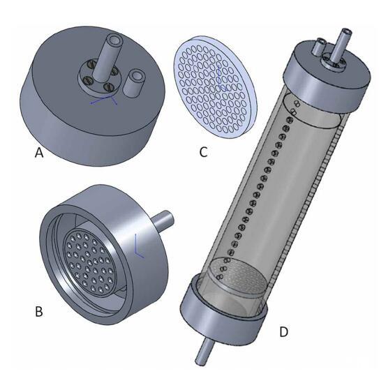 圖3:。槽襯套的單個組件。(A)頂蓋(外部視圖,PVC),帶進水管(中、長、分配容器未顯示)和出水管(短、右),(B)底蓋,帶進水管和分配容器(PVC),(C)帶開口的過濾器支架(PVC),(D)帶三行取樣孔的槽內襯(聚碳酸酯),內部配備過濾器支架(聚碳酸酯),頂蓋(進出口),和底蓋(流入口)。