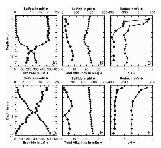 圖8:。在360天運行時間后,即更換流速后50天,在新高流量巖心(NHFC;A-C)和新低流量巖心(NLFC;D-F)沉積物中測得的地球化學參數。所示為硫酸鹽、溴化物(A和D)、硫化物、總堿度(B和E)、氧化還原電位和pH值(C和F)的孔隙水剖面。