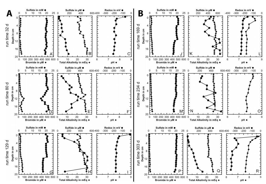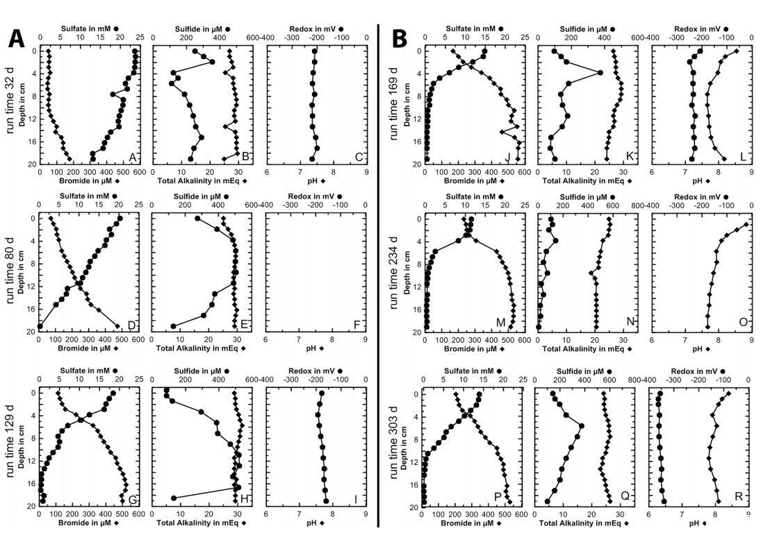 圖5:。在運行32(A、B、C)、80(D和E)、129(G、H和I)、169(J、K、L)、234(M、N、O)和303(P、Q R)天后,在埃克恩費爾德灣低流量巖芯(LFC)沉積物中測得的地球化學參數。所示為硫酸鹽、溴化物(A、D、G、J、M和P)、硫化物、總堿度(B、E、H、K、N和Q)、氧化還原電位(C、I、L和R)和pH值(L、O和R)。