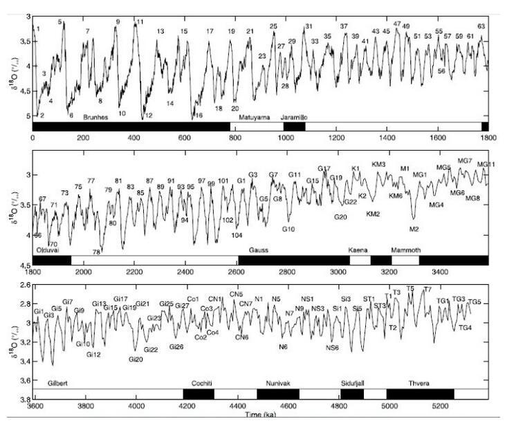 LR04曲線,數字為第四紀MIS編號,奇數為間冰期(暖期),偶數為冰期(冷期),下面方框是地球磁場分期黑色為正向,白色為反向。LR04深海沉積曲線顯著反映了米蘭科維奇的冰期-間冰期旋回理論,和氣溫的周期性變化。