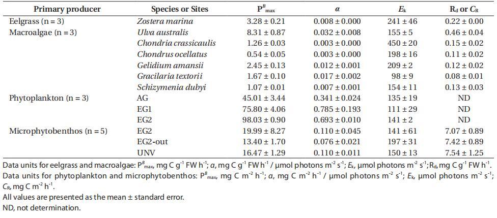 浮游植物的光合特性因植被類型的不同而明顯不同,但微生物群落的光合特性與生境類型的差異不顯著(附錄3H&I)。在鰻草層中觀察到浮游植物的面積PB max和α較高,鰻草層(EG1和EG2)的PB max和α平均比AG高93%,α平均高117%。三個棲息地浮游植物組合的Ek值范圍為111至141μmol光子m-2 s-1,這些值在植被類型之間沒有太大差異。微細(xì)胞底棲生物的面積PB max的光合參數(shù)在鰻草層最高(EG2,19.99±8.27 mg C m-2 h-1),在鰻草層外側(cè)最低(EG2 out,13.40±1.70 mg C m-2 h-1)。鰻草層中微細(xì)胞底棲動物的α與深層沉積生境中的α相似(平均值為0.110 mg C m-2 h-1/μmol光子m-2 h-1),該值比鰻草層外的值(EG2 out)高44%。無論棲息地類型如何,微型底棲生物的Ek范圍為141至197μmol光子m-2 s-1。此外,包括在微型底棲生物和微生物呼吸中的沉積物呼吸,在棲息地類型之間沒有顯示出很大的差異,范圍為7.07-7.54 mg C m-2 h-1。總之,優(yōu)勢大型植物和微生物群落的光合作用和呼吸作用是評估群落和生態(tài)系統(tǒng)產(chǎn)量的重要因素。