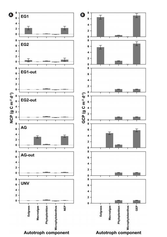植被群落的GCP較高,但高呼吸速率是植被系統(tǒng)高GCP的潛在抵消因子。具體而言,與微藻群落(浮游植物和微型底棲生物)相比,鰻草類和大型藻類群落表現(xiàn)出極高的NCP和GCP(圖2)。此外,在EG1和EG2中,鵝草床的GCP分別為6.51±0.67和5.70±0.62 g C m-2 d-1,鵝草的NCP分別占EG1和EG2 GCP的35%和10%。大型藻類植被(AG)的NCP占GCP的63%,GCP和NCP值分別為4.83和3.05 g C m-2 d-1。遠(yuǎn)洋浮游植物群落是一個凈自養(yǎng)系統(tǒng)(平均值為0.288 g C m-2 d-1),而無論群落類型如何,底棲微生物墊都顯示出凈異養(yǎng)群落(平均值為-0.156 g C m-2 d-1)。