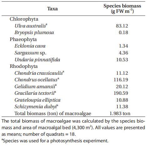 在大型藻類植被現(xiàn)場(AG),沿潮下巖岸分布著11種大型藻類,其中2種為綠藻,3種為褐藻,6種為紅藻(表2)。其中,6個物種(Ulva australis、Gelidium amansii、Gracilaria textorii、Schizymenia dubyi、Chondria crasicaulis和Chondrus ocellatus)占大型藻類總生物量的91%,在4300 m2的大型藻類植被面積中約占2濕噸。一半以上的大型藻類生物量(64%)分布在淺海潮下帶區(qū)域(約2米深),81%的生物量分布在水深<4米的區(qū)域。在綠藻中,澳大利亞U.australis的個體生物量最高(平均83.12克FW m-2,范圍從0到627.47克FW m-2),占大型藻類總生物量的18%,主要分布在上海岸帶。其中兩種紅藻,克氏絲藻和短尾絲藻的生物量比其他物種高得多,克氏絲藻的生物量介于0到1320.69克FW m-2(平均190.59克FW m-2)之間,短尾絲藻的生物量介于0到1012.66克FW m-2(平均116.19克FW m-2)之間,分別占大型藻類總生物量的41%和25%(表2)。