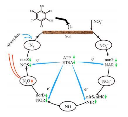 殺菌劑百菌清(CHT)因其高效、殺菌等優點在茶園中得到廣泛應用。據報道,反復施用CHT會抑制土壤硝化過程。然而,CHT對土壤反硝化和相關N2O排放的急性影響尚不清楚。本研究評估了硝酸鹽(NO3?)72℃高溫處理后茶園土壤的去除、反硝化基因豐度和反硝化酶活性。結果發現,將CHT從5 mg kg增加到25 mg kg?1抑制NO3?去除效率從74.6%提高到54.1%,但N2O排放量從23.1%增加到94.8%。用25 mg kg治療后?在CHT中,nirK、nirS和nosZ基因的豐度分別降低了31.6%、22.1%和50.7%。另外,電子傳遞系統活性(ETSA)值和三磷酸腺苷(ATP)含量的下降表明CHT對微生物代謝有抑制作用。酶活性研究進一步表明,硝酸還原酶(NAR)、亞硝酸鹽還原酶(NIR)和一氧化氮還原酶(NOR)活性的降低是CHT抑制反硝化作用的主要原因。此外,反硝化還原酶活性與細胞內代謝呈正相關,表明微生物代謝的減少也應是CHT對反硝化過程的抑制作用的原因。總的來說,研究發現,土壤急性暴露于CHT可抑制反硝化過程并顯著增加N2O排放,這可能導致土壤氮循環破壞和全球變暖加劇。