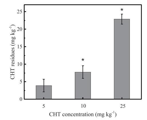 圖1.三種濃度的百菌清(CHT)(5、10和25 mg kg)的殘留?1)施用后72小時在土壤中。誤差條表示三次測試的標準偏差。A*以上數據表明對照組和CHT處理之間存在顯著差異(P b 0.05)。