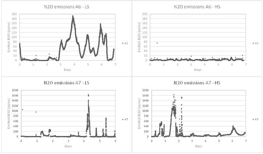 圖3、BR4淡季(LS)采樣位置a)A3和b)A4和BR4(HS)旺季采樣位置c)A3和d)A4的N2O排放和曝氣率比較。N2O排放的主要貢獻者是兩個季節(jié)的BR4,該反應器中排放的每日動態(tài)(加上曝氣率)。HS期間的排放量低于LS期間。在LS期間,與HS相比,排放更不穩(wěn)定。