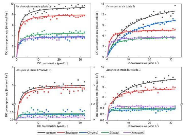 圖3、以乙酸、琥珀酸、甘油、乙醇和甲醇為碳源對應的反硝化細菌(clade I)、施式假單胞菌(cladeⅡ)/固氮羅菌屬I09(cladeⅡ)、固氮羅菌屬I13(cladeⅡ)的氧氣消耗率的全細胞Michaelis-Menten曲線。這些數據是從三次試驗中獲得的。