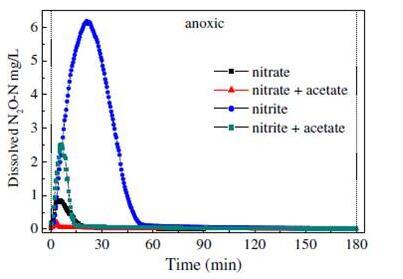 圖1、、不同條件下的N2O的產生特征,只添加醋酸鹽鹽,同吋添加酸鹽和乙酸鈉,只添加亞硝酸鹽、同時添加亞銷酸和乙酸鈉。圖中可以看出,當系統中不添加外碳源乙酸,DPAOs以厭氧段合成的胞內聚合物PHA為碳源進行反硝化,反應過程中有相應的N2O產生,但是其最高累積量達0.85mg/L。而系統中添加外碳源乙酸時,首先利用乙酸鈉為碳源進行反硝化,其最高累積量僅有0.21mg/L,遠低于沒有外加碳源添加時的N2O產生量。這也是說明當以為碳源進行反硝化時將會導致的N2O產生量增加。相比外碳源乙酸鈉,PHA為慢速生物降解物質,當被用于反硝化碳源時,其單位時間內提供的電子不能滿足反硝化的需求,導致反硝化過程中各種酶對電子形成競爭。由于N2O的還原處于反硝化反應鏈的末端,導致相比別的還原酶,氧化亞氮還原酶對電子的競爭能力弱,獲得的電子不足以使N2O完全還原,從而誘發了N2O積累。