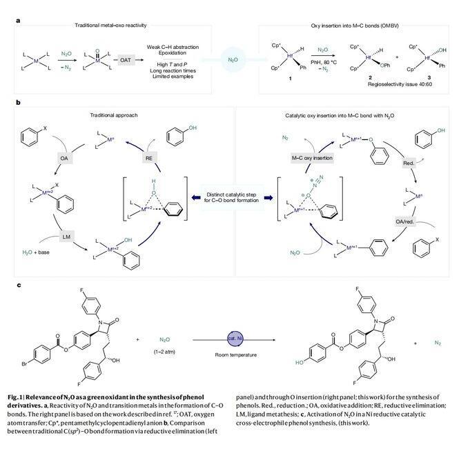 開發一氧化二氮(N2O,又作笑氣)重新利用的催化化學工藝,對減輕其排放所帶來的環境威脅有極大的意義。傳統上,N2O被認為是一種惰性分子,由于其活化需要的苛刻條件(>150 oC,50-200 bar),有機化學家難以將其作為氧化劑或氧原子轉移試劑。近期,德國馬克斯-普朗克煤炭研究所的Josep Cornella教授課題組報道了在溫和條件下(室溫,1.5-2 bar N2O)將N2O插入Ni-C鍵,從而提供高附加值的酚類化合物并釋放無污染的N2。