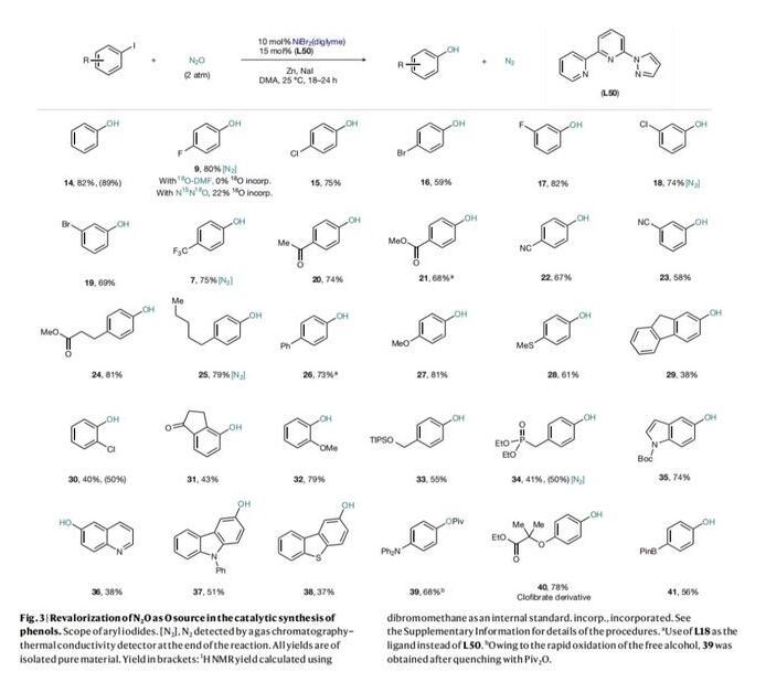 Josep Cornella教授課題組將N2O作為綠色氧源,利用有機金屬Ni配合物活化N2O,在溫和條件下成功地將一系列芳基鹵化物高選擇性地轉化為高價值的酚類化合物。這種獨特的有機金屬C-O鍵形成不同于當前基于還原消除的策略,并為芳基鹵化物轉化為酚類化合物提供了新方法和新借鑒。
