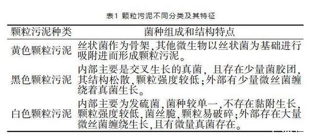 有研究通過對所培養出的不同顏色顆粒污泥進行破碎處理,得到絲狀菌在顆粒污泥中的形成結構。好氧顆粒污泥在反應器不同階段出現黃色、黑色及白色3種不同顏色的顆粒,不同顆粒污泥的菌種比例及形態結構都有所區別。總體來說,絲狀菌對好氧顆粒污泥的形成及穩定起到重要作用。不同顏色顆粒污泥的菌種組成及結構特點見表1。
