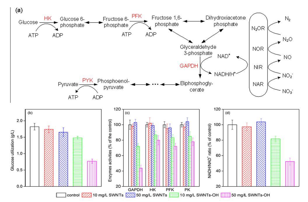 圖5.葡萄糖轉化途徑的示意圖(a),以及單壁碳納米管和單壁碳管OH暴露24小時對利用葡萄糖濃度(b)、參與糖酵解的關鍵酶的相對活性(c)和細胞內NADH/NAD+比率(d)的影響。誤差條表示三次測量的標準偏差。