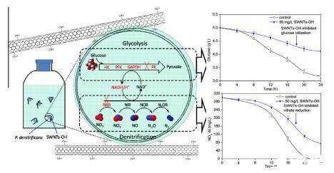 功能化基團通常附著在單壁碳納米管(SWNT)的表面,以改善其突出的特性,從而獲得更廣泛的應用。然而,羥基修飾的單壁碳納米管對反硝化微生物的潛在影響尚不清楚。在本研究中,通過使用脫氮副球菌作為模型反硝化微生物,研究了單壁碳納米管OH對反硝化的影響。與原始單壁碳納米管相比,50mg/L單壁碳管OH的存在顯著降低了反硝化效率,從99.3%降至75.0%。機制研究表明,單壁碳納米管OH抑制了負責糖酵解的關鍵酶,這是由于分散性的增加、與酶蛋白的結合電位、與膜相互作用的可能性以及活性氧物種的產生。因此,反硝化細菌利用碳源(葡萄糖)的代謝受到嚴重干擾,隨后細菌的生長和反硝化電子供體(NADH)的生成下降。進一步的研究表明,單壁碳納米管OH還降低了硝酸還原酶的活性。單壁碳納米管OH釋放到環境中可能會對生物圈中的氮循環造成嚴重干擾。