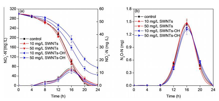 圖2.在24小時暴露試驗期間,單壁碳納米管和單壁碳管OH對NO3-N(固體,a)、NO2-N(空心,a)和N2O(b)變化的影響。誤差條表示三次測量的標準偏差。