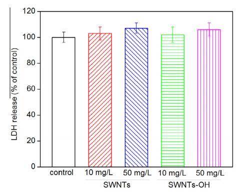 通常,由于高比表面積和生物活性,納米材料很可能附著到細胞表面,細胞與納米材料之間的物理接觸已經得到證實[45]。在此,圖3顯示了反硝化梭菌在與50mg/L的單壁碳納米管或單壁碳管OH接觸24小時后的細胞形態的SEM圖像。可以看出,單壁碳氮納米管和單壁碳T OH附著在球形反硝化梭魚的表面上。與對照組相比,暴露于SWNT和SWNT OH的細胞仍保持完整的形態。文獻中使用LDH釋放分析來研究納米材料對細胞結構完整性的影響[24],結果(圖4)表明,在不存在和存在碳納米管的情況下,LDH釋放沒有顯著差異(p>0.05)。因此,10或50 mg/L的單壁碳納米管或單壁碳管OH的存在不會引起反硝化梭菌細胞膜的損傷和細胞質的滲漏。