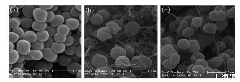 圖3.反硝化梭菌暴露于0(a)和50 mg/L單壁碳納米管(b)和單壁碳管OH(c)24小時的SEM圖像。