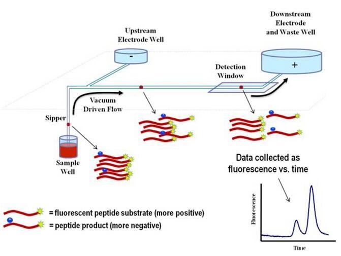藥物分析在藥物分析領域,微流控芯片能降低藥物分析成本,使藥物分析檢測的手段更為豐富,也使藥物分析更加微型化和集成化,滿足藥物分析的新場景要求。一般在單一主成分藥物分析中,微流控芯片具有檢測微型化、快速化、樣品試劑消耗低等優點。在更復雜的多成分藥物分析中,通常會聯合在線富集技術以進一步提高檢測靈敏度。比如,Wu M等使用微流控芯片激光誘導熒光檢測器,使用場放大樣品堆積(FASS)和反向場堆積(RFS)的片上多重富集方法,同時分析卡那霉素、萬古霉素和慶大霉素的含量,這種與在線多重富集方法的聯用讓檢測靈敏度提高了近300倍,三種抗生素的檢測限可達0.20~0.80μg/L。實際上,微流控分析還在手性藥物毒性分析、血液尿液等藥物濃度分析、藥代動力學分析等領域具有巨大應用價值。藥物篩選微流控芯片在藥物篩選領域,可分為分子、細胞和整體動物三個層次。在分子水平,美國Caliper Life Science(已被PerkinElmer收購)開發了EZ Reader生物芯片。LabChip®EZ Reader在聚丙烯微孔板中測定熒光標記的反應物,微流控芯片包括連接上游和下游電極的小通道,每次檢測時微量流體被“啜飲”到微孔板中。當反應物通過上述通道移動時,反應組分憑借其流動性差異被分離,其遷移率差異與被測組分的電荷/質量比有關,每個成分到達芯片上的檢測窗口時,儀器會記錄一個熒光峰(圖1)。以酶學檢測為例,應用EZ Reader芯片的實驗底物是帶有熒光標記的多肽,底物在反應體系中酶的作用下轉變為產物,其所帶的電荷也發生相應的變化,利用底物和產物所帶電荷的不同,將二者在芯片通道中進行分離,達到分別檢測的目的。EZ Reader芯片的拓展應用場景還包括激酶級聯反應、表觀遺傳學分析、激酶的酶譜分析、核酸/蛋白結合分析等生物分子學實驗。1661662851706320
