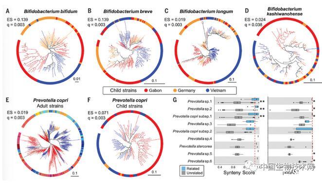 一些腸道細(xì)菌的行為就像它們是人類基因組的一部分,正處在從“自由的活細(xì)菌’到依賴人體環(huán)境的梯度上,它們顯示出似乎已經(jīng)獲得了對(duì)宿主不可逆的依賴性。這從根本上改變了我們對(duì)人類腸道菌群的看法。 隨后,研究人員對(duì)兒童參與者(平均年齡7.4個(gè)月)的腸道宏基因組進(jìn)行了采樣。與其母親的數(shù)據(jù)結(jié)合分析,讓他們有了一個(gè)前所未有的機(jī)會(huì)來測(cè)試兒童腸道菌群的共同多樣化模式。在測(cè)試的20個(gè)最常見的兒童分類群中,有9個(gè)顯示出共同多樣化的證據(jù)。其中, 長(zhǎng)雙歧桿菌顯示出最有力的共同多樣化 。幾個(gè)分類群的協(xié)同多樣化信號(hào)在加蓬和德國的兒童中得到擴(kuò)展,但在越南兒童參與者中沒有被發(fā)現(xiàn)。這些結(jié)果表明 ,生命早期腸道常見的細(xì)菌也與人類共同多樣化。
