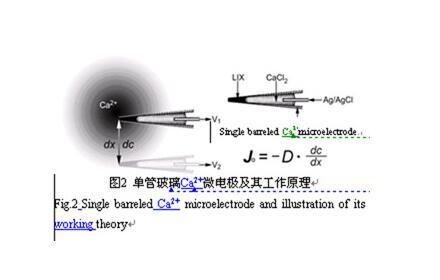 μ=μo+RT㏑γc+zFVb,式中μo為電化學(xué)勢參考值,z為離子化合價數(shù),γ為離子在溶液中的活動系數(shù),F(xiàn)為法拉第常數(shù)(96500 C/mol),R為氣體常數(shù)(8.3 J mol-1K-1),T為熱力學(xué)溫度(K)。當(dāng)離子選擇微電極的尖端緩慢移動(不攪動溶液)一段距離(dx)時,新位置處的電化學(xué)勢為μ+dμ,此處的dμ為新位置處的濃度c與電勢Vb的變化值,而電化學(xué)勢參考值μo不變。標(biāo)準(zhǔn)電化學(xué)理論認(rèn)為,根據(jù)離子濃度c(mol/m)、離子的運(yùn)動速度u(m s-1mol-1newton-1)以及電化學(xué)勢梯度(dμ/dx),就能計算出離子的凈流量J(mol m-2s-1):