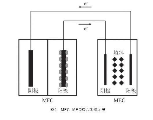 其中,MFC-MEC耦合系統(tǒng)以其耗能小、脫氮效果良好成為當(dāng)前BES領(lǐng)域的研究熱點(diǎn)之一。該耦合系統(tǒng)將MFC的陽極、陰極分別與MEC的陰極、陽極相連,作為直流電源驅(qū)動(dòng)MEC,裝置如圖2所示。直流電驅(qū)動(dòng)BES反應(yīng)器(即MEC系統(tǒng))可以實(shí)現(xiàn)較高的反硝化速率,但耗能也較高,而利用MFC驅(qū)動(dòng)可直接利用有機(jī)物中的電能,并以微電流的形式施加至MEC,刺激MEC中脫氮微生物的活性,大大降低了能耗及運(yùn)行成本。
