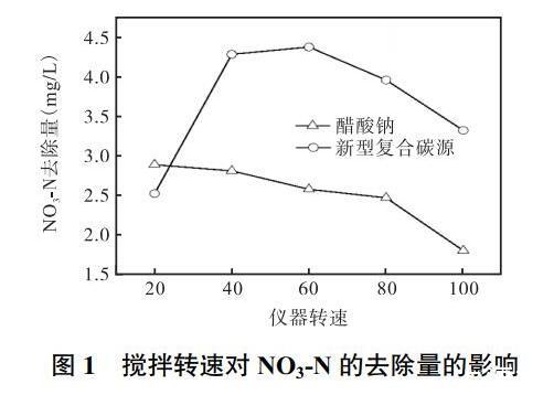 由圖1可知,對于新型復合碳源轉速試驗,NO3-N去除量在轉速為20~60rpm范圍內,隨轉速的增加而增加,這主要是由于轉速的增大有利于微生物與碳源、硝酸鹽的充分接觸,從而增大NO3-N的去除量,在繼續增大轉速至120rpm時,NO3-N的去除量隨轉速的增大反而下降。這一方面可能是轉速的增大導致了微生物凝聚體被打散,影響了微生物的活性;另一方面轉速的增大導致空氣中向反應器中的富氧速率增大,引起了水中的溶解氧增加,導致微生物以氧氣為電子載體,從而影響NO3-N的去除。因此,對于新型復合碳源轉速實驗下的儀器轉速確定為60rpm。