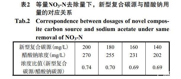 由圖3可知,對新型復合碳源和醋酸鈉碳源,NO3-N去除量均隨著碳源濃度的增加呈線性增加。在200mg/L新型復合碳源下的NO3-N去除量為4.79mg/L,而在獲得等量的NO3-N的去除量下,所需醋酸鈉濃度為270mg/L;同理在200mg/L醋酸鈉濃度下NO3-N的去除量為3.34mg/L,而在獲得相同NO3-N去除量前提下,所需的新型復合碳源濃度僅為140mg/L。由圖3可獲得在相同NO3-N去除量下,其他新型復合碳源濃度與醋酸鈉濃度的對應關系,見表2。從該表中可知,在獲得等量的NO3-N去除量下,相比醋酸鈉碳源,新型復合碳源可節省30%用量。