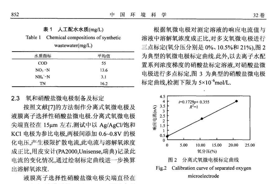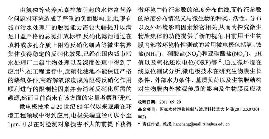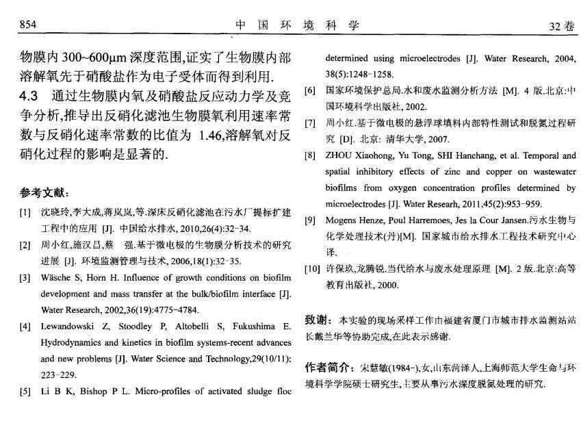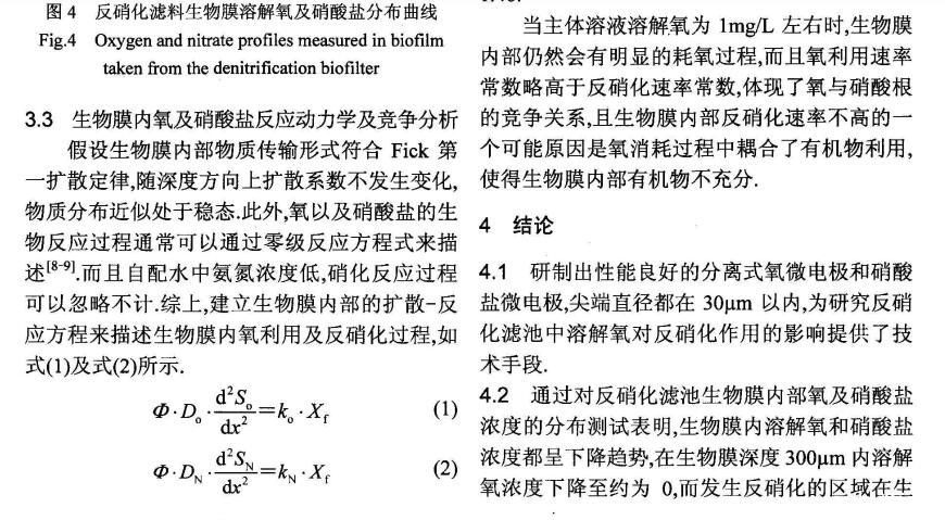 為研究反硝化濾池中溶解氧對反硝化作用的影響,制備性能良好尖端直徑在30μm以內(nèi)的氧(O2)以及硝酸鹽(NO3-)微電極,以此為測試工具,對反硝化濾池中生物膜內(nèi)部O2、NO3-微環(huán)境分布進(jìn)行測試,通過建立擴(kuò)散-反應(yīng)方程,獲得生物膜微環(huán)境耗氧及反硝化活性特征。研究結(jié)果表明,溶解氧在生物膜內(nèi)部呈明顯的下降趨勢,從主體溶液氧濃度約1mg/L下降至生物膜300μm深度處約為0.生物膜內(nèi)部反硝化活性區(qū)域發(fā)生在300~600μm深度范圍內(nèi)。該條件下反硝化濾池生物膜的氧利用速率常數(shù)以及反硝化速率常數(shù)之間的比值為1.46,溶解氧對反硝化過程的影響是顯著的。