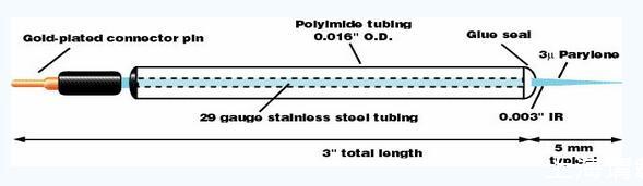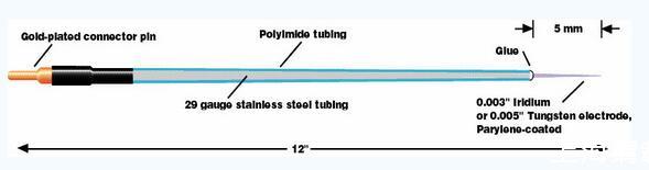 這些電極在屏蔽式電信號(hào)記錄和激發(fā)電位應(yīng)用方面是非常出色的,尤其適合于雙極刺激。該電極尖端是由鎢絲制成,直徑為75微米。外層不銹鋼導(dǎo)體管用0.2毫米厚度的多聚亞胺絕緣材料包裹直到不銹鋼管的末端,也可以提供沒有絕緣材料包裹的這類電極。